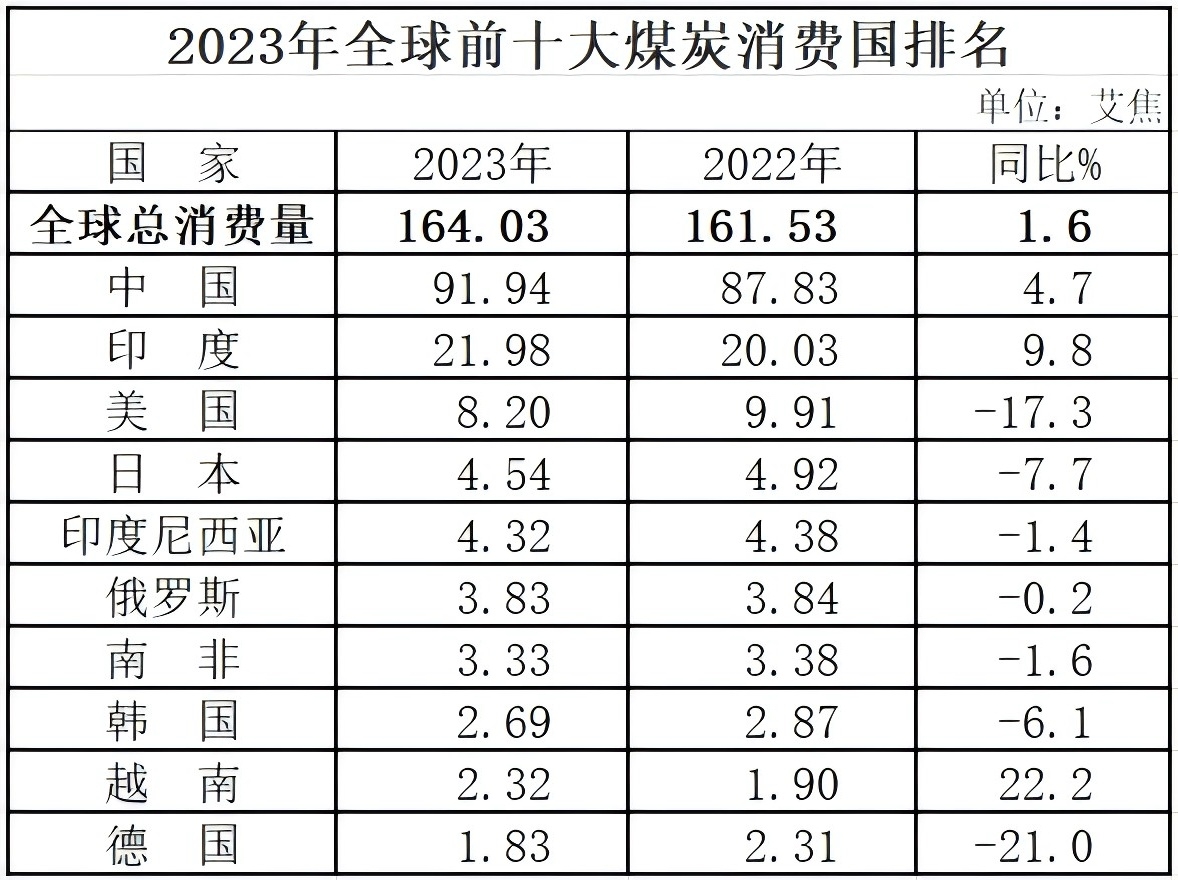 2023年,中國(guó)煤炭消費(fèi)量為91.94艾焦(EJ),同比增長(zhǎng)4.7%,占全球總消費(fèi)量的56.0%。消費(fèi)量排名前十的國(guó)家分別為:中國(guó)、印度、美國(guó)、日本、印度尼西亞、俄羅斯、南非、韓國(guó)、越南和德國(guó)。其中,中國(guó)、印度和越南煤炭消費(fèi)量較上年有所增加。