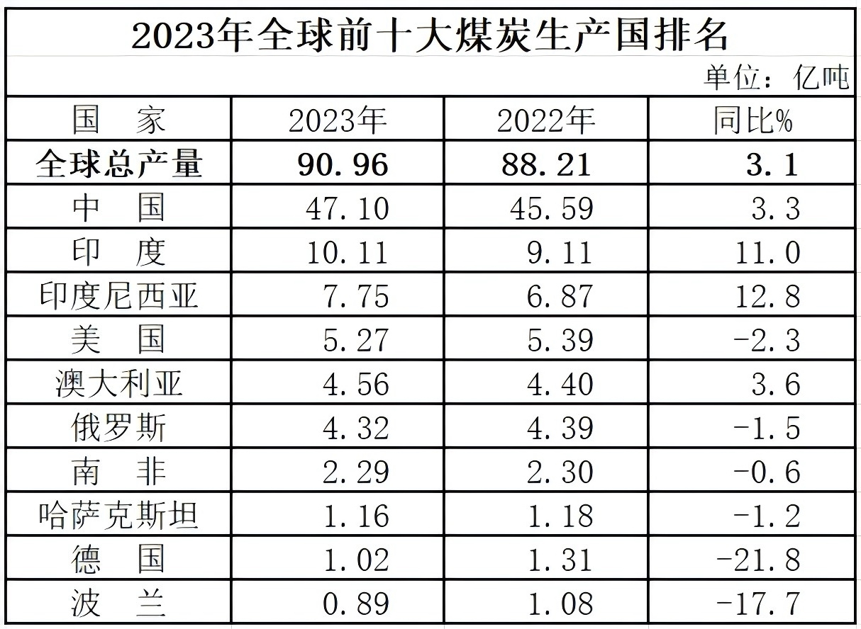 2023年,中國(guó)煤炭產(chǎn)量47.1億噸,同比增長(zhǎng)3.3%,占全球總產(chǎn)量的51.8%。煤炭產(chǎn)量?jī)|噸以上的國(guó)家分別為:中國(guó)、印度、印度尼西亞、美國(guó)、澳大利亞、俄羅斯、南非、哈薩克斯坦、德國(guó)。其中,中國(guó)、印度、印度尼西亞和澳大利亞煤炭產(chǎn)量較上年有所增加。